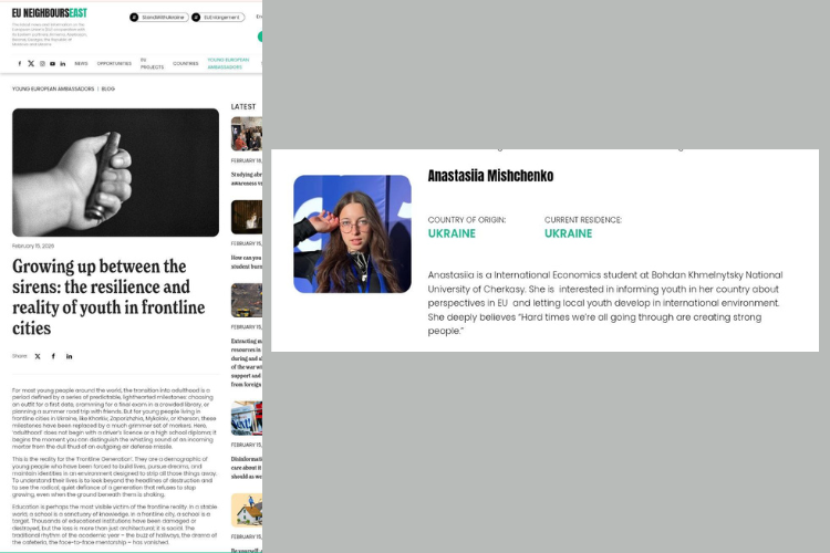 A first-year student of the Educational-Scientific Institute of Economics and Law at Bohdan Khmelnytsky National University of Cherkasy, Anastasiia Mishchenko, has joined the international initiative EU NEIGHBOURS EAST as a Young European Ambassador and recently published her first blog on the campaign’s official website.