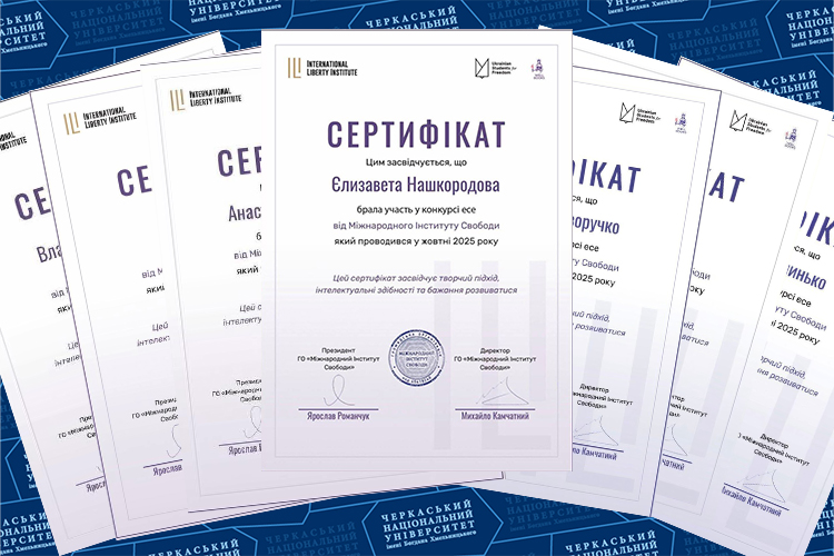 Здобувачі першого (бакалаврського) рівня, першого курсу, спеціальності D3 «Менеджмент» ННІ економіки і права Черкаського національного університету імені Богдана Хмельницького взяли участь у конкурсі есе організованому Міжнародним Інститутом Свободи (International Liberty Institute) спільно з Ukrainian Students for Freedom.