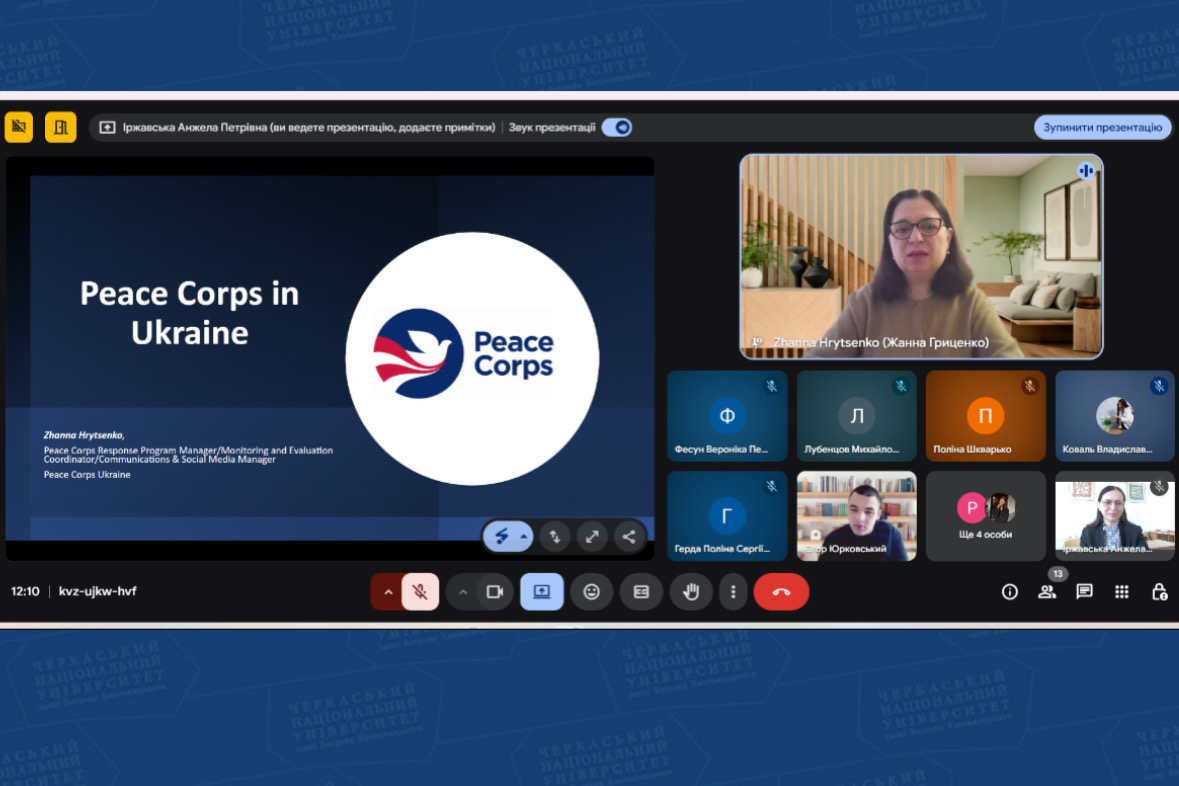 У межах вивчення навчальної дисципліни «Міжнародні організації» та з метою спілкування з майбутніми стейкхолдерами студенти 1 курсу спеціальності «Міжнародні відносини» ННІ міжнародних відносин, історії та філософії Черкаського національного університету імені Богдана Хмельницького поспілкувалися з програмною менеджеркою, координаторкою з моніторингу та оцінки, менеджеркою із соцмереж та комунікацій Корпусу миру США в Україні (Peace Corps-Ukraine) Жанною Гриценко.